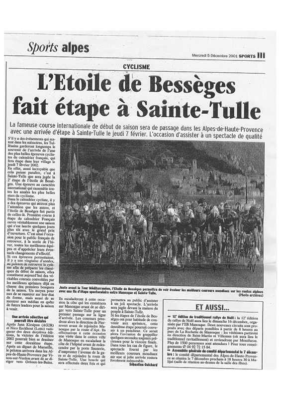 - maillot du vainqueur de l'Étoile de Bessèges, évènement international accueilli à Ste-Tulle en 2002, dédicacé par Poulidor, Anglade, Kobler et par le commentateur bien connu Daniel Mangeas